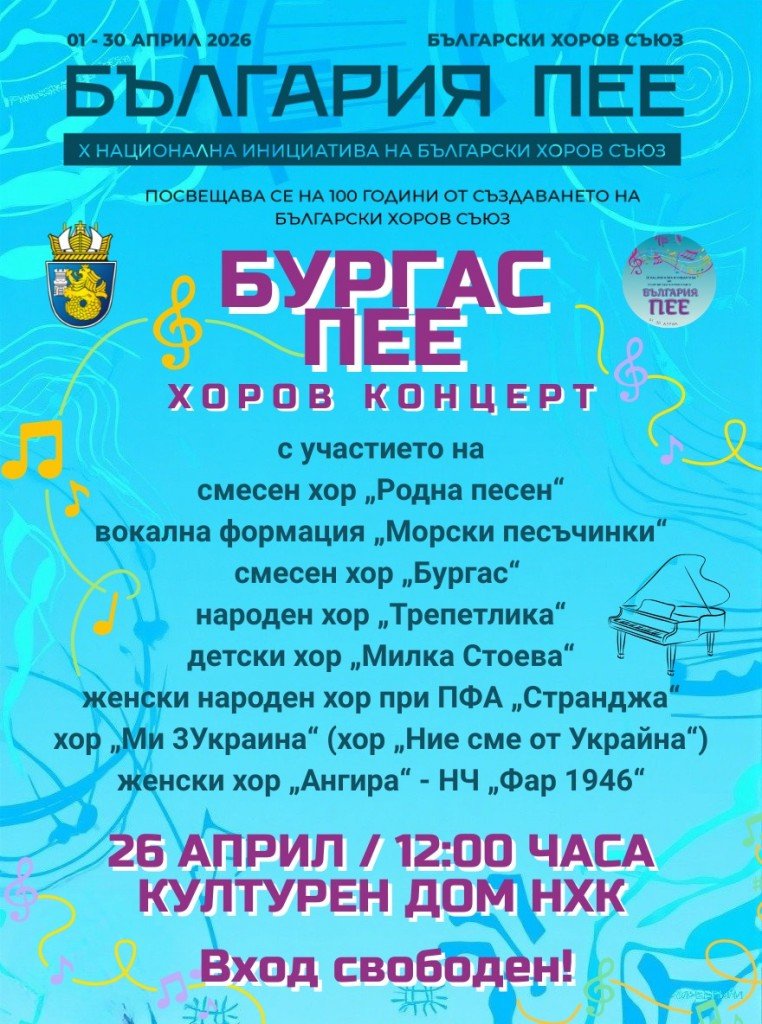 На 26 април Бургас отново се включва в националната инициатива „България пее“. В 12:00 часа в зала „Тончо Русев“ на Културен дом НХК ще се проведе хоровият концерт „Бургас пее“. Събитието е част от X национална инициатива на Българския хоров съюз. То е посветено на 100-годишнината от създаването на организацията.