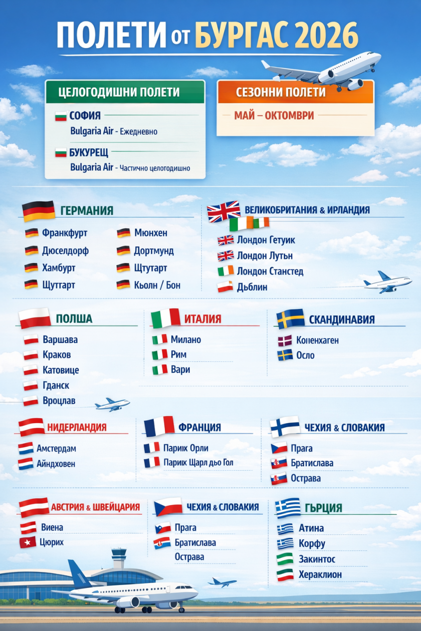 Сезонни полети от Бургас (април – октомври 2026 г.)