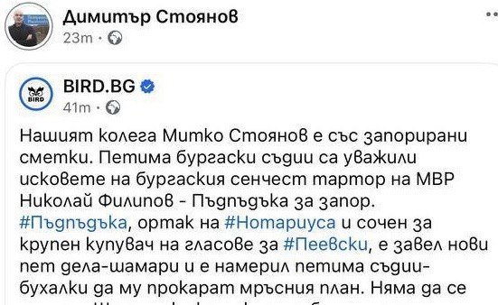 Най-често тези обвързаности са откровено политически, основно с ПП-ДБ, а в останалите случаи пък става дума за някаква лична вендета и ненавист към определени лица от страна на журналистите в BIRD. Примерите затова вече са много, като сега ще ви дадем като показателен само последния, в който журналист от BIRD се оказа със запорирани сметки, защото от години атакува голям бургаски бизнесмен, без обаче да има нито едно доказателство срещу него. Става дума Димитър Стоянов от BIRD, който се оказа със запорирани сметки след като петима (забележете петима!), бургаски съдии уважиха исковете на бизнесмена Николай Филипов срещу него. В позиция на BIRD и Димитър Стоянов, разпространена из социалните медии, последните без никакво притеснение обвързват с конкретния случая куп имена и прякори, които обаче нямат нищо общо с разглеждания казус. Нещо повече. BIRD и Димитър Стоянов си позволяват най-откровено и директно да заплашват петима български съдии с това, че щели да извадят публично техните имена, снимки, имущество и дипломи. Или с други думи – осъдените, заплашват представители на съдебната власт със саморазправа и публично унижение. Наричат ги „съдии – бухалки“ и заплашват, че щели да организират тяхното дисциплинарно уволнение от ВСС.
